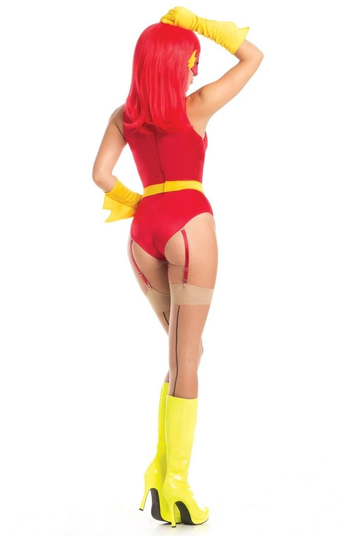 5 Piece Feisty Flash. Leotard belt gloves mask and garter straps.(Hollywood wig and thigh highs sold separately).