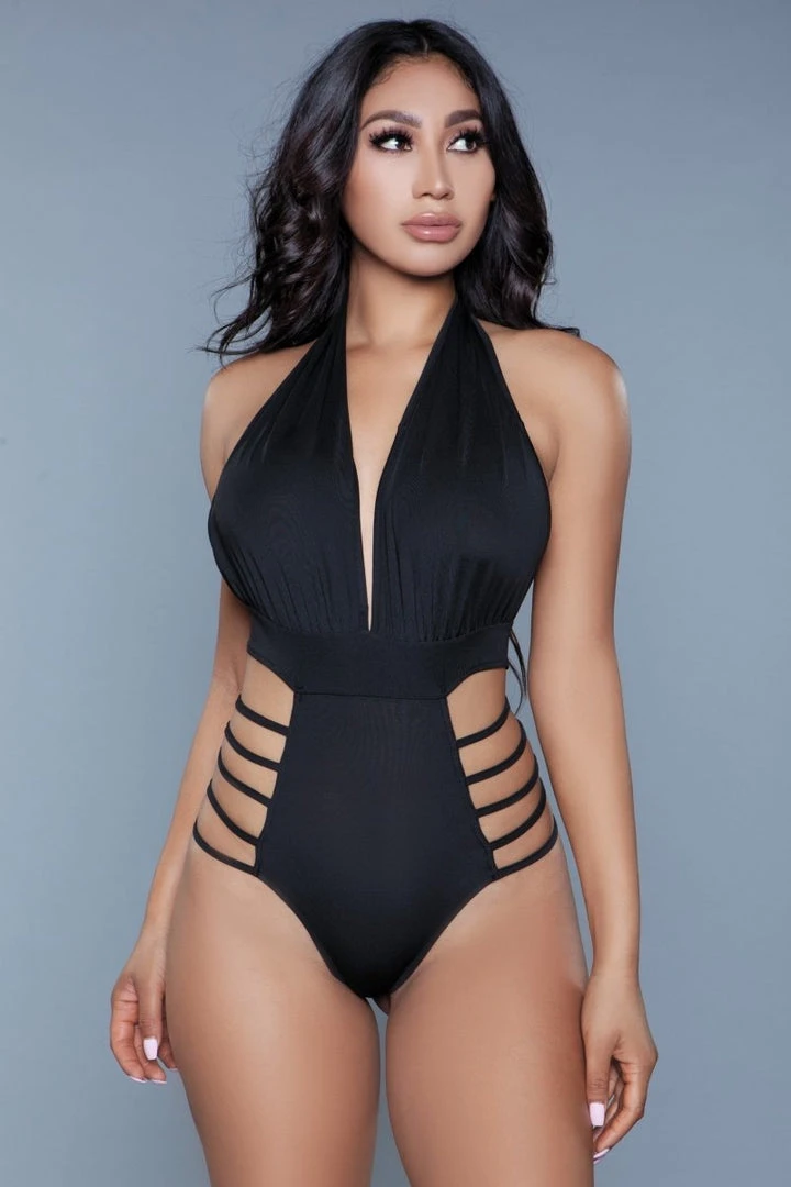1 Piece. Plunge V neckline swimsuit with halter tie backless and strappy detail sides.Β