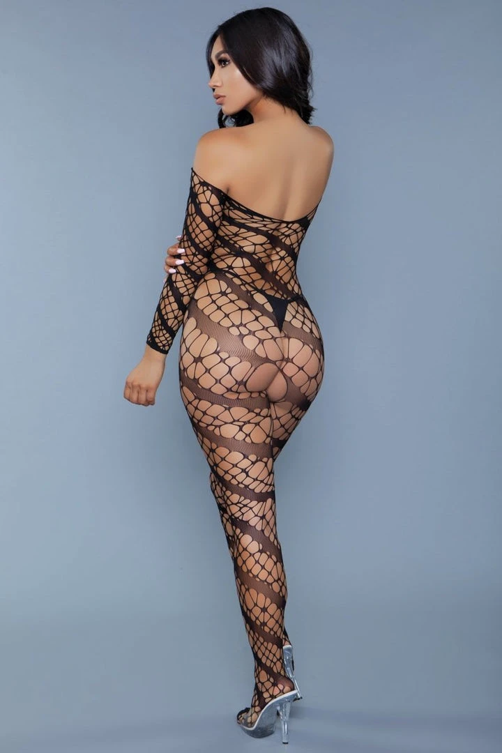 Web fishnet detail solid slanted stripes mid-arm length full bodystocking.