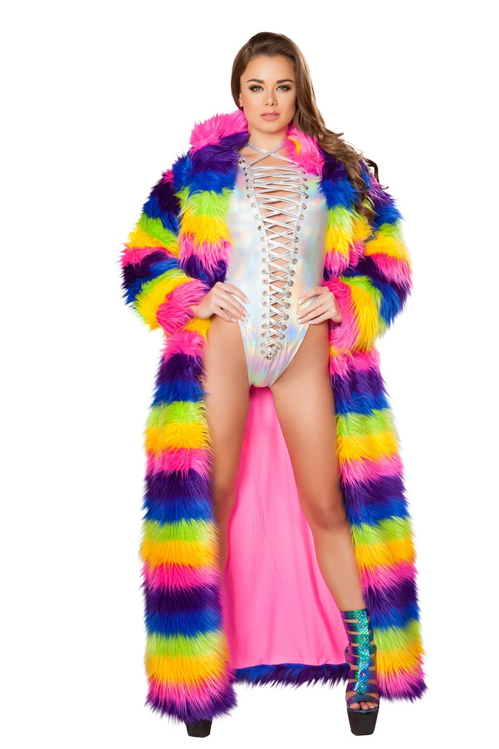 Long Sleeve Rainbow Long Coat feature a full length multicolor rainbow faux fur, fully lined. Glow under black light.