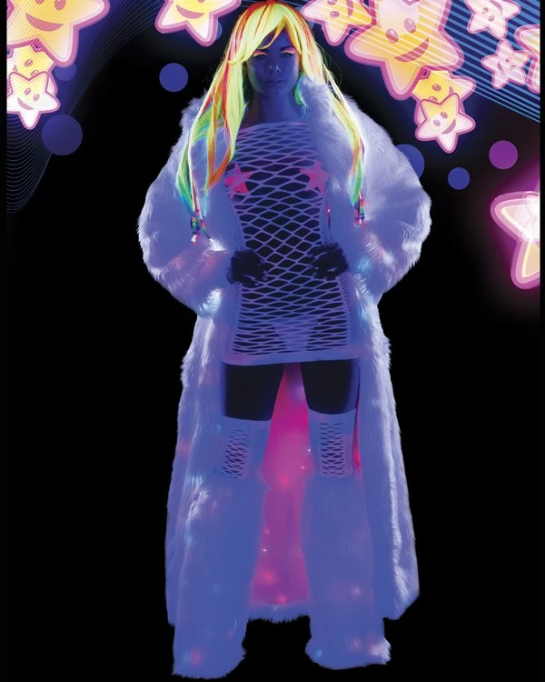 Light Up White Cosmos Legwarmers includes 1 pair, Faux Fur Light-up legwarmers with cosmos print extra-wide elastic band for a comfortable fit. Glow under black light